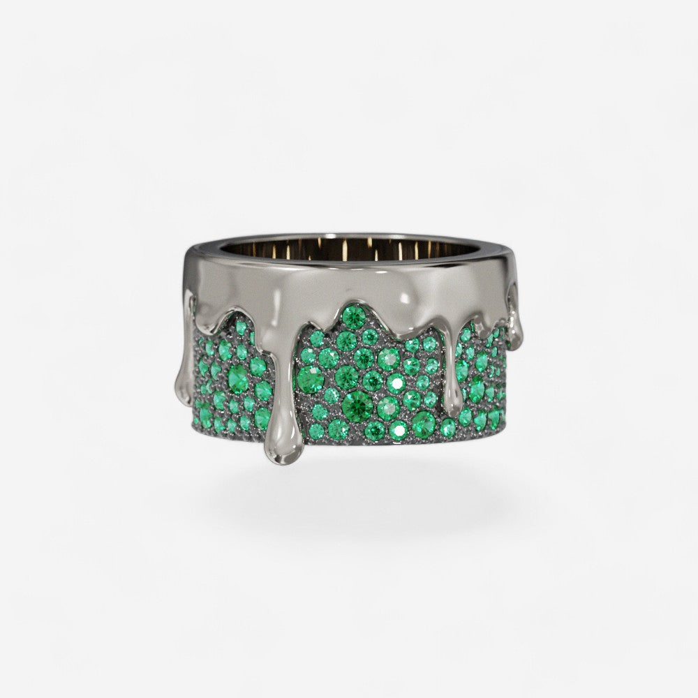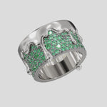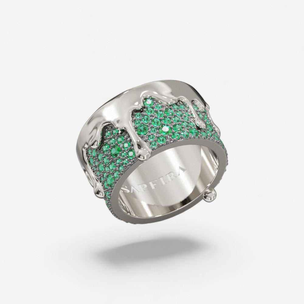 The SULTRY ring captures the essence of cascading liquid silver, creating a unique and enchanting visual appeal. The silvery metal swirls and curves delicately, mimicking the organic flow of liquid mercury, while the gemstones add a vibrant touch of color and sparkle.
