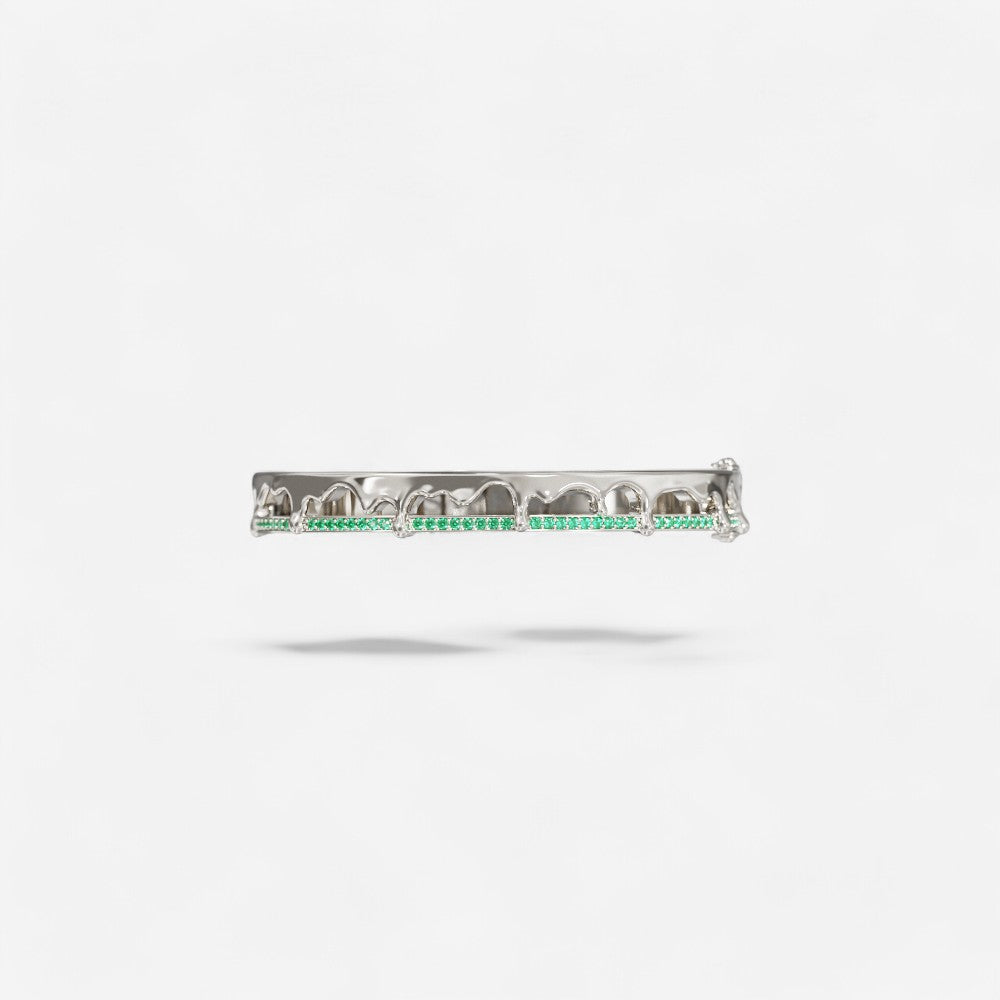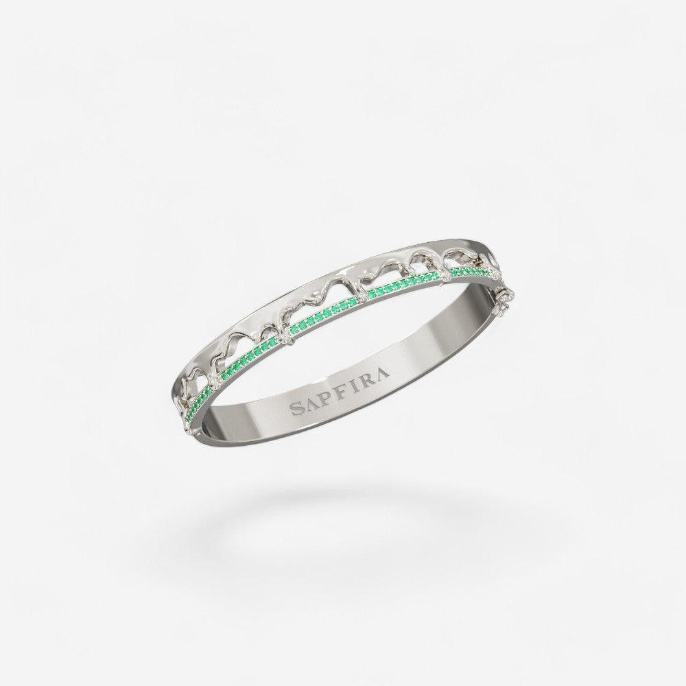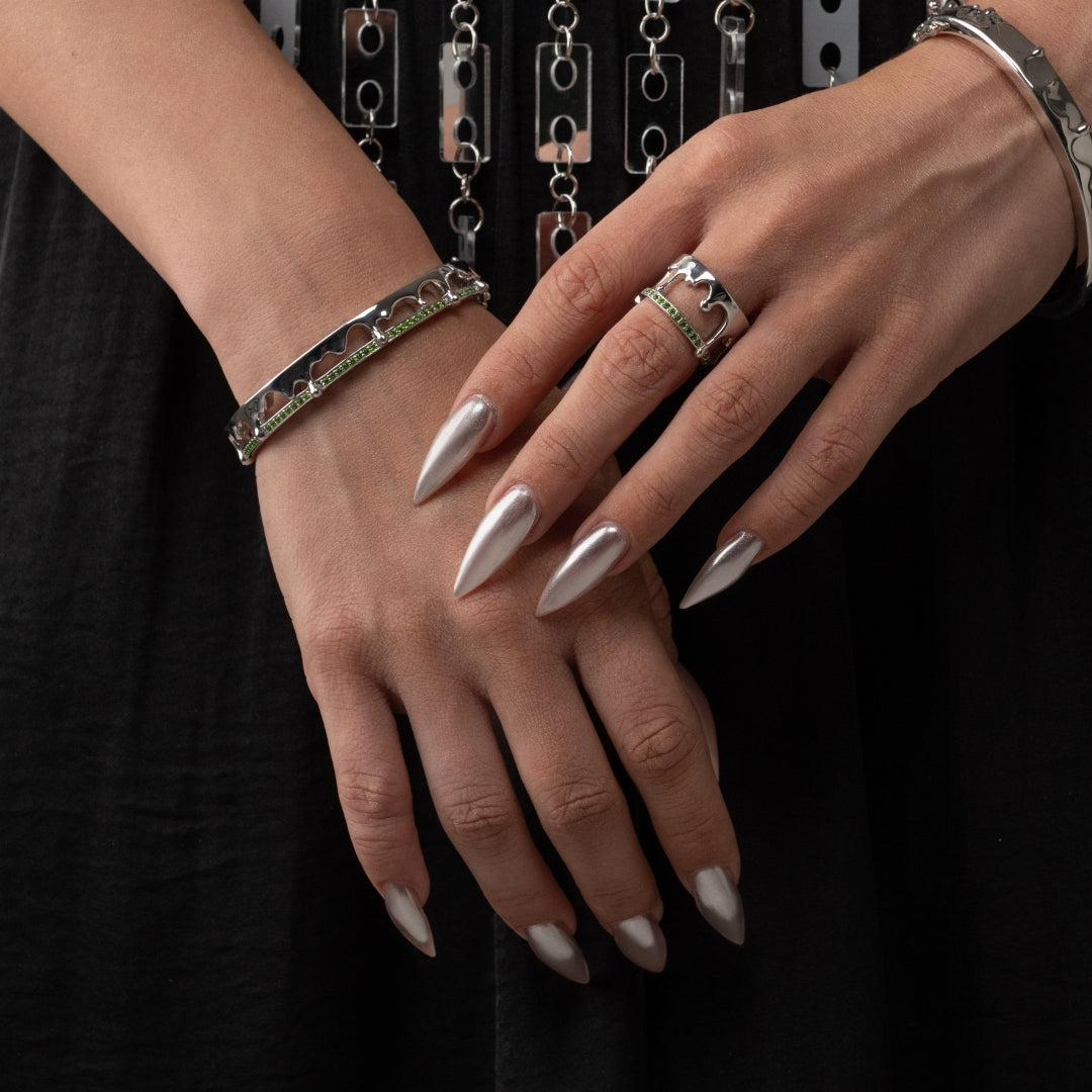 빛나는 은색 디자인이 손목을 감싸며, 은은하게 세팅된 보석들이 신비로움과 광채를 더해줍니다. 유기적이면서도 시간이 지나도 변치 않는 아름다움을 약속합니다.